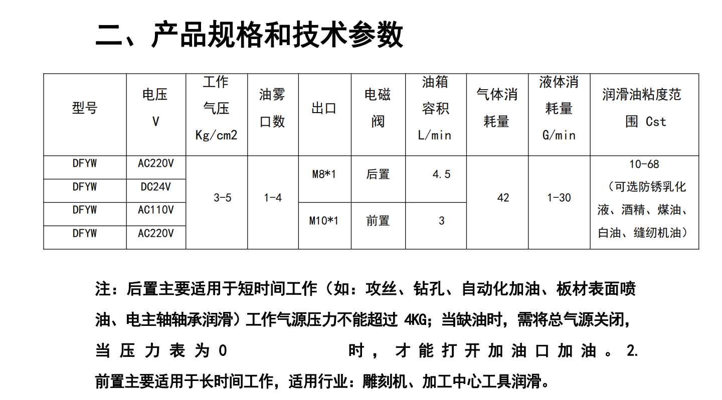 一、油霧潤(rùn)滑簡(jiǎn)介: 油霧潤(rùn)滑是一種新型的稀油集中潤(rùn)滑方式,已成功的應(yīng)用于滾動(dòng)軸承、 滑動(dòng)軸承、齒輪、蝸輪、鏈輪及滑動(dòng)導(dǎo)軌等各種摩擦副。 油霧潤(rùn)滑具有良好的潤(rùn)滑效果、耗油量小、便于防止成品被潤(rùn)滑油污 染、散熱好、能提高滾動(dòng)軸承極限轉(zhuǎn)速、設(shè)備簡(jiǎn)單、重量輕、占地面積 小、成本及維修費(fèi)用低、以及便于集中管理等特點(diǎn)。其缺點(diǎn)是排出的空氣 中含有懸浮油微粒,污染環(huán)境,需設(shè)置環(huán)保設(shè)施并達(dá)到環(huán)保要求,可以選 用環(huán)保無(wú)污染潤(rùn)滑油,此外還需具備壓縮空氣源。 油霧潤(rùn)滑裝置工作原理:當(dāng)電磁閥通電接通后,壓縮空氣經(jīng)分水濾氣器 過(guò)濾,進(jìn)入調(diào)壓閥減壓,使壓力達(dá)到工作氣壓,經(jīng)減壓后的空氣進(jìn)入油霧發(fā)生 器,在發(fā)生器內(nèi),進(jìn)行霧化,油霧經(jīng)油霧裝置出口排出,通過(guò)系統(tǒng)管 路、凝 縮嘴送到潤(rùn)滑點(diǎn)。 在油霧的形成、輸送、凝縮、潤(rùn)滑過(guò)程中的較佳參數(shù)如下:油霧顆粒的直徑 一般為 1-3um;空氣管線壓力為 0.3-0.5Mpa;油霧濃度(在標(biāo)準(zhǔn)狀況 下,每立方米油霧中的含油量)在 3-12g/m3;油霧在管道中的輸送速度為 5-7m/s;輸送距離一般不超過(guò) 20m;凝縮嘴根據(jù)摩擦副的不同,與摩擦副保持5-25mm 的距離。 注:后置主要適用于短時(shí)間工作(如:攻絲、鉆孔、自動(dòng)化加油、板材表面噴 油、電主軸軸承潤(rùn)滑)工作氣源壓力不能超過(guò) 4KG;當(dāng)缺油時(shí),需將總氣源關(guān)閉, 當(dāng) 壓 力 表 為 0 時(shí) , 才 能 打 開(kāi) 加 油 口 加 油 。 2. 前置主要適用于長(zhǎng)時(shí)間工作,適用行業(yè):雕刻機(jī)、加工中心工具潤(rùn)滑。